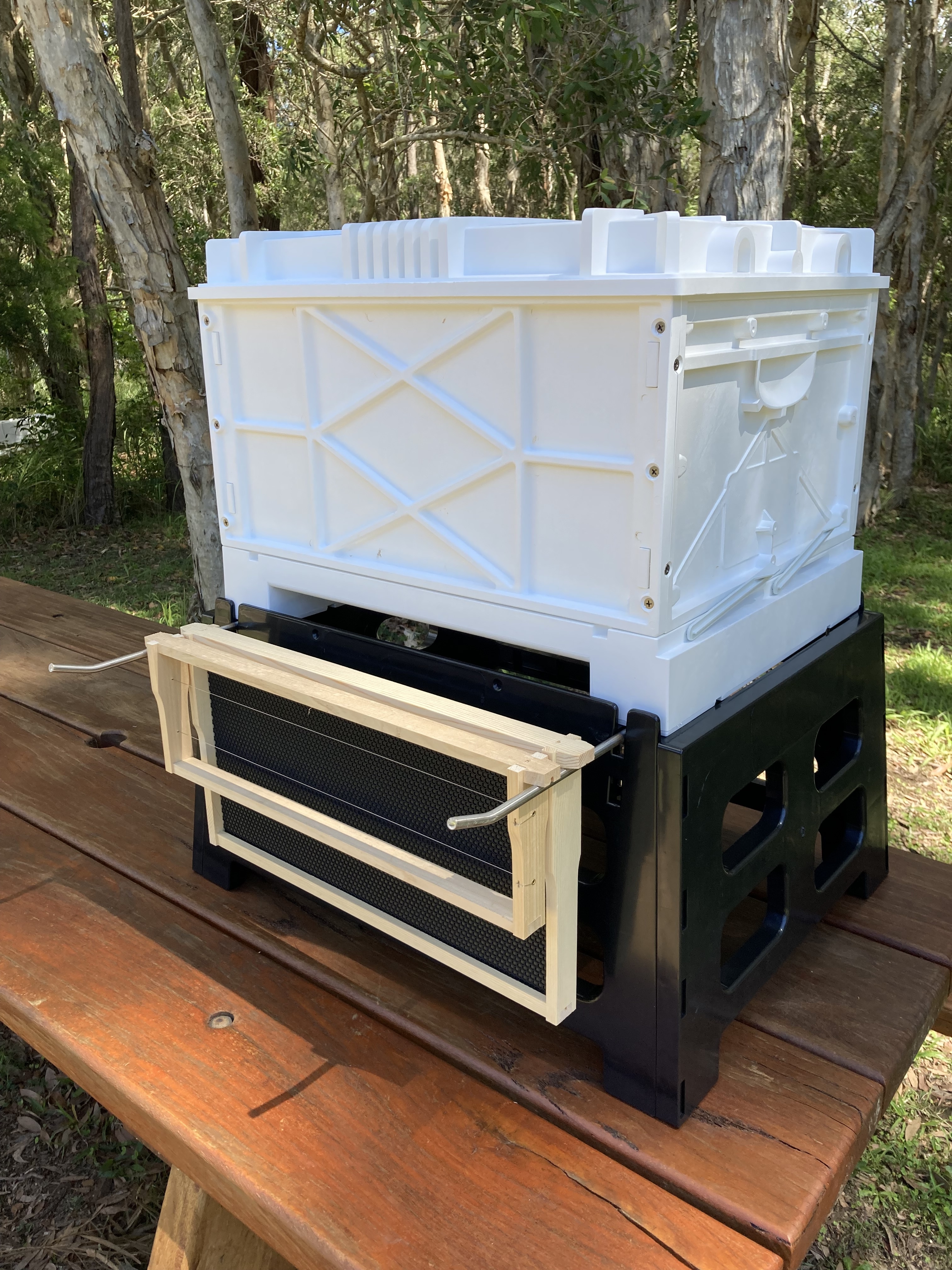Designed to easily collect pollen on a large or small scale. Features a bypass that enables bees through to collect pollen, which can be closed. Pollen collection occurs in the sliding tray system underneath the vented base. Mount Brood Box and Supers atop the Pollen Trap.